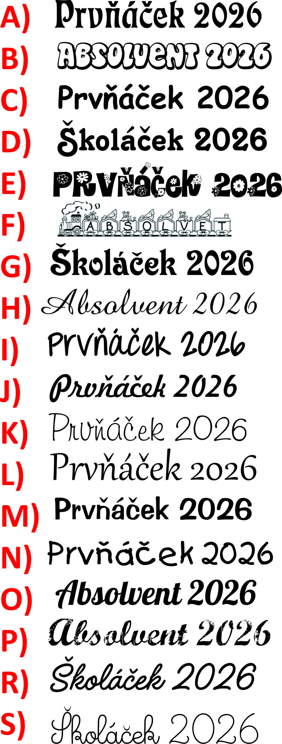 Text přední strany : ŠKOLÁČEK 2026, PRVŇÁČEK 2026, apod.